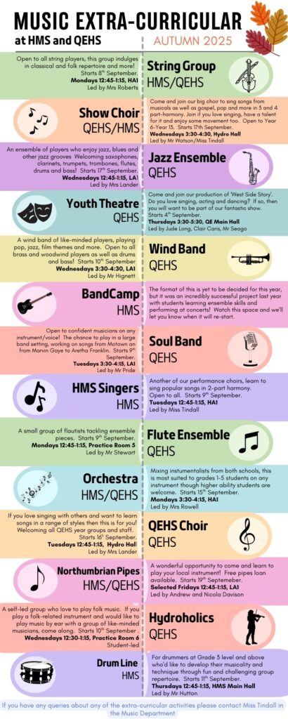 Welcome back to our fantastic offering of Music extra-curricular activities. Please take a look at the attached flyer to find out more about what each group is and where and when they take place. The start date is on the flyer. This weeks sees the return of HMS Singers, String Ensemble and the Drum Line.