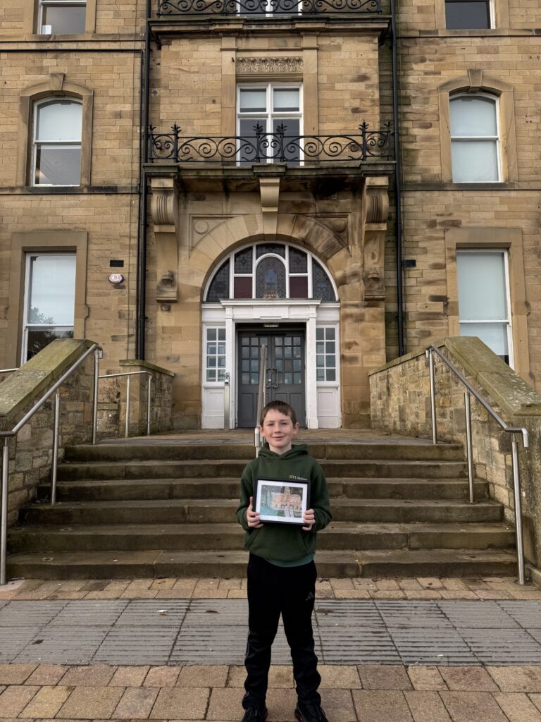 You may have read yesterday that Elliott has designed this year’s ‘HMS Christmas Card’. Elliott is very proud of his card design and enjoyed spending time creating his entry. Here’s Elliott with his winning card – ‘Hydro on Christmas Eve’ – in front of the Hydro building. Cards can be ordered via the MCAS shop now.