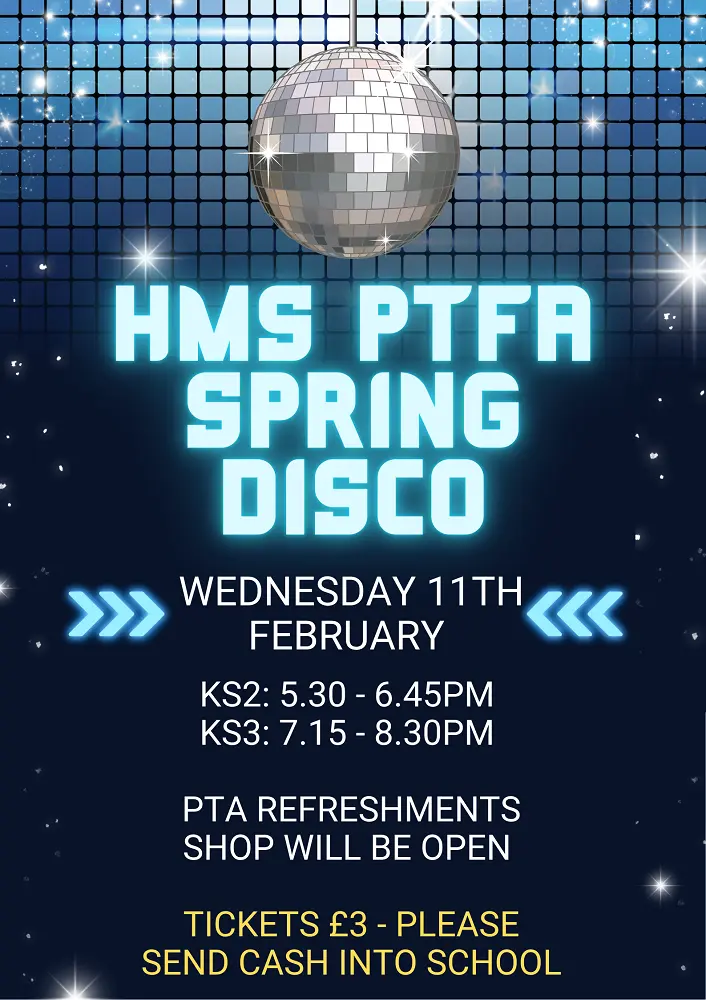 HMS PTFA Spring Discos15 January 2026News, PTFA We are very excited to announce that our Spring Discos will take place on Wednesday 11th February. The sign-up form will be shared in the ‘Weekly Update’ on Friday. Please send £3 into the school office for your child’s ticket. #Respect #Engage #Aspire