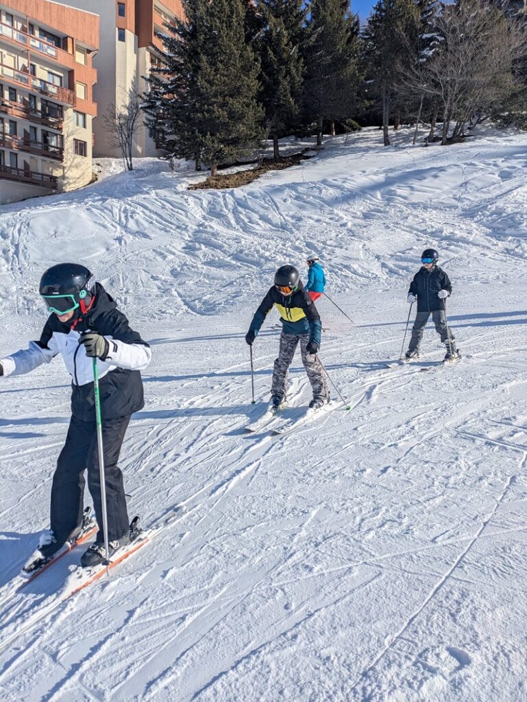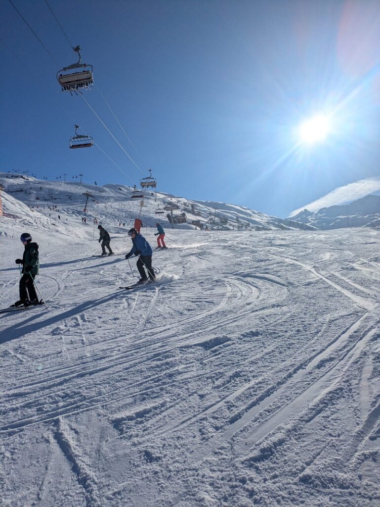 Mr Johnson’s group focused on parallel turns and enjoyed some paired racing. Mrs Barnett’s and Mr Gaines’ groups are skiing together and explored new slopes and used the bucket and chair lifts (lots of laughs with one or two fallers at the top!). Mr Whitfield’s group went up to the high point of Pont De La Masse yesterday and reported that it was windy and cold on top, but they had a superb descent on a long blue slope – idyllic!