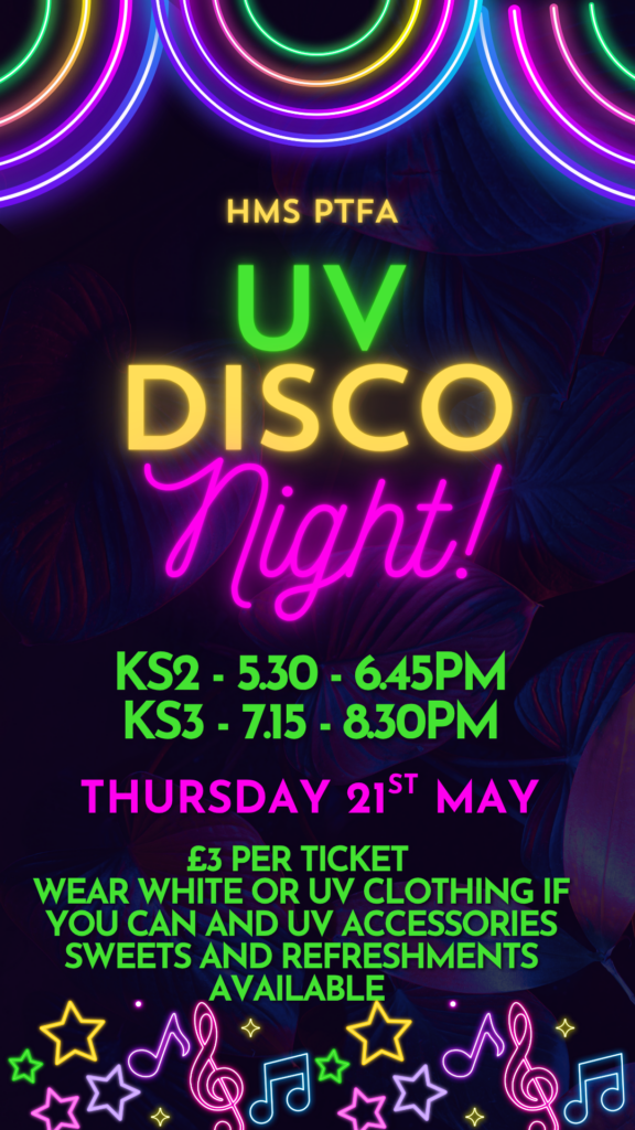 We are very excited to announce that our Summer Discos – this time with added UV – will take place on Thursday 21st May. The sign-up form will be shared in the ‘Weekly Update’ on Thursday 2nd April. Please send £3 into the school office for your child’s ticket.