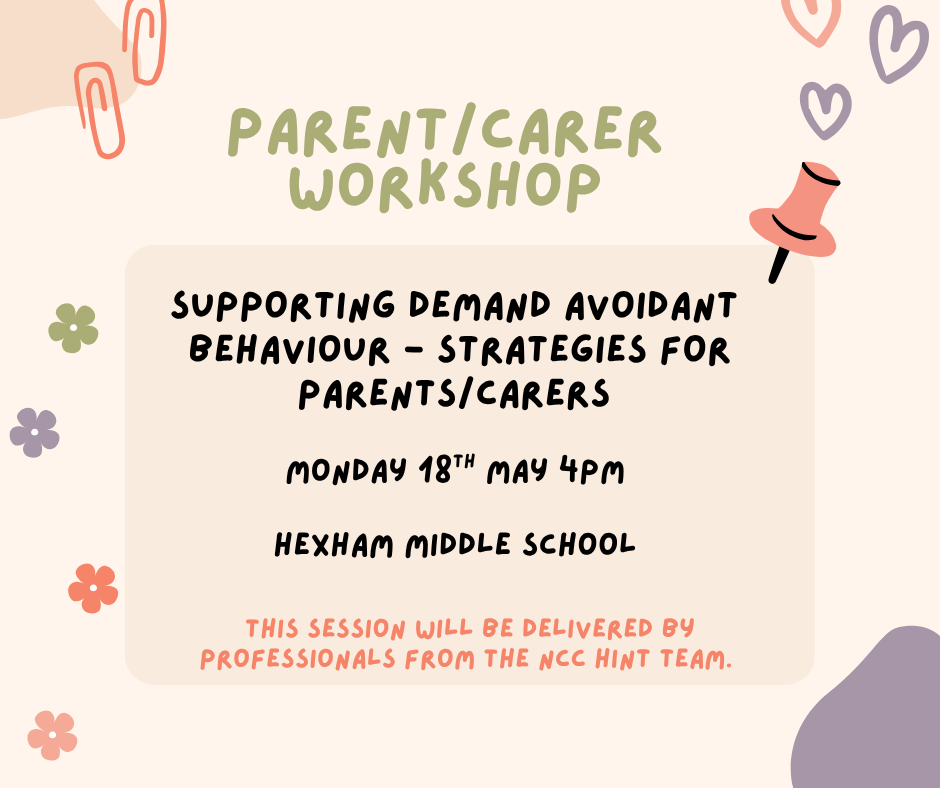 We have organised a parent/carer workshop to be delivered by professionals from the HINT team focused on sharing strategies for supporting children who show demand avoidant behaviours. The workshop will take place on Monday 18th May 4pm at Hexham Middle School. The session will focus on understanding demand avoidance and strategies to support parents/carers and children at home.