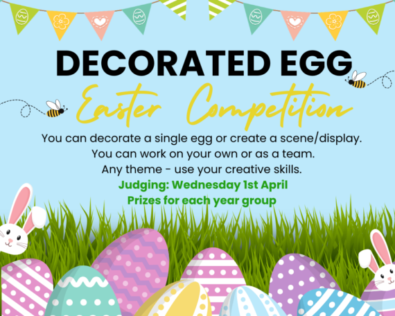 It’s time to get creative for our Easter competition. Your task is to decorate an egg or to create a scene/display of eggs. You can choose any theme – the more imaginative, the better! You can work on your own or as a team. Themes could include your favourite TV show, film, book characters, sports team and so much more